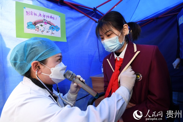 開(kāi)學(xué)在即,貴陽(yáng)市南明區(qū)舉行初三、高三年級(jí)新冠肺炎應(yīng)急處置演練現(xiàn)場(chǎng)觀摩。圖為學(xué)校駐點(diǎn)醫(yī)生正在臨時(shí)留觀處對(duì)“體溫異常”的學(xué)生進(jìn)行詢問(wèn)和進(jìn)一步檢查。趙松 攝