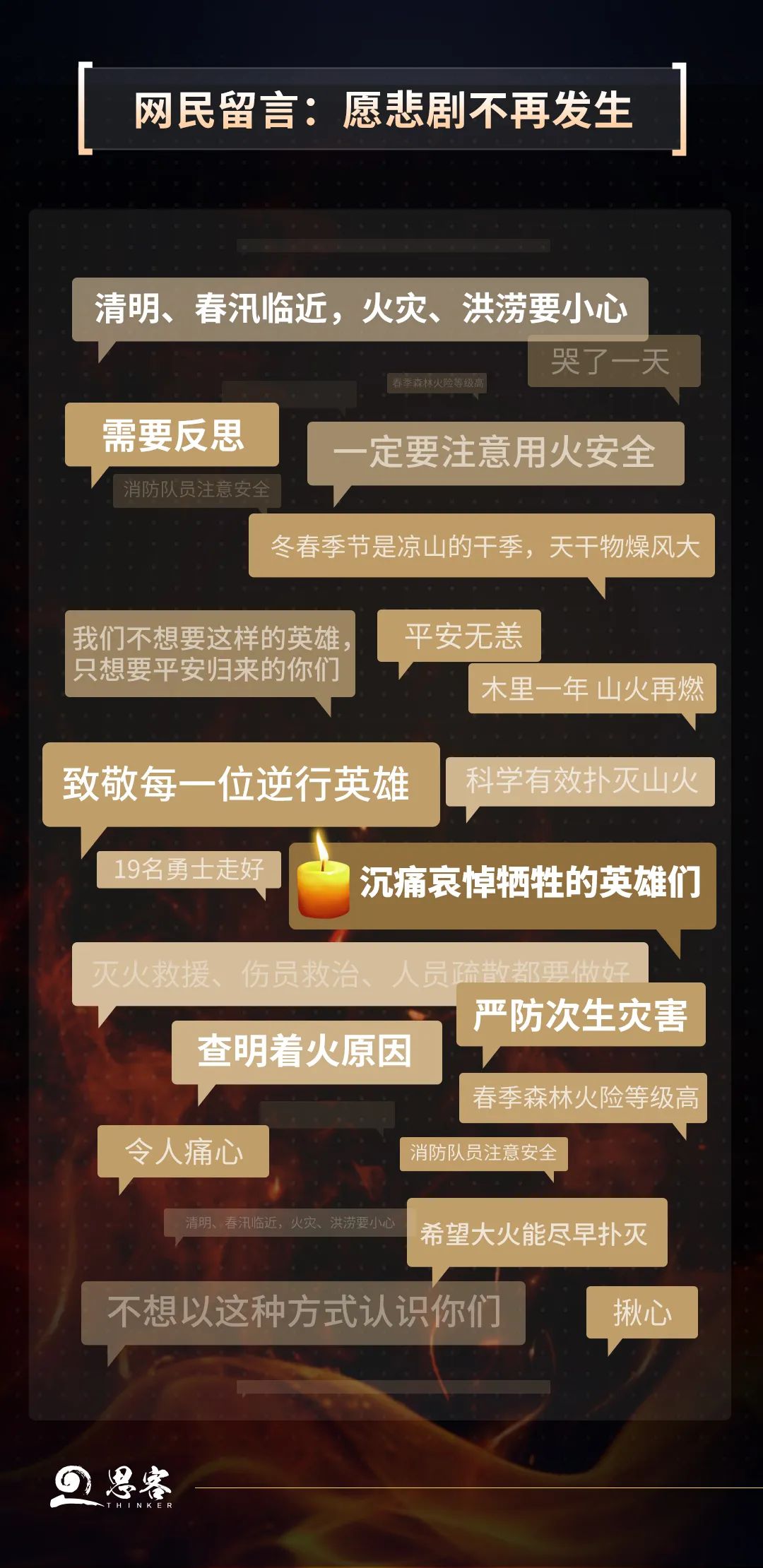 “火災(zāi)”“英雄”“反思”是網(wǎng)民留言中的高頻詞,“我們不想要這樣的英雄,只想要平安歸來的你們”成為網(wǎng)民共同心聲。逆火而行的英雄值得尊敬,但確保撲火人員安全更是前提。有網(wǎng)民說,一年前,四川木里的那場大火,造成31人不幸犧牲;一年后,又是一場大火,再次奪走19條鮮活的生命。春天天干物燥、山火肆虐蔓延、風(fēng)向突然變化,兩次火災(zāi)場景何其相似。我們需要認(rèn)真反思,加大對風(fēng)向突變的預(yù)判,利用更多科技手段滅火,避免火災(zāi)“風(fēng)”險(xiǎn)悲劇重演。