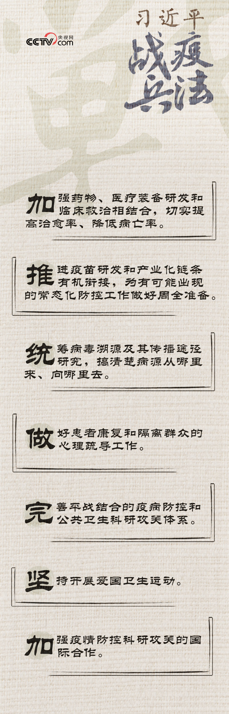 從“遭遇戰(zhàn)”到“阻擊戰(zhàn)”,從“重中之重”到“人民戰(zhàn)爭(zhēng)”,從“頭等大事”到“全面勝利”……觀勢(shì)、謀局、落子,總書(shū)記在親自指揮這場(chǎng)人民戰(zhàn)爭(zhēng)的過(guò)程中,很多對(duì)策、措施與中國(guó)古代兵家思想高度契合。央視網(wǎng)《人民領(lǐng)袖》欄目推出系列特稿《習(xí)近平戰(zhàn)“疫”兵法》,與您一同領(lǐng)悟其中精髓。