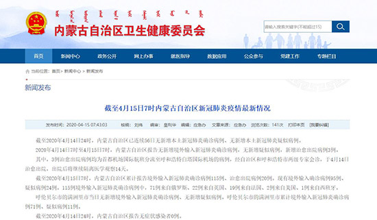 2020年4月14日7時(shí)至4月15日7時(shí),內(nèi)蒙古自治區(qū)報(bào)告無(wú)新增境外輸入新冠肺炎確診病例,無(wú)新增疑似病例,新增治愈出院病例3例。