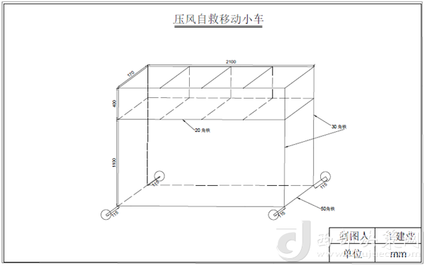 圖紙畫好后,王建業(yè)火速發(fā)給了材料員老王,老王憑借多年的人脈,在車間找來電焊師傅,又拾了廢棄的幾塊角鋼和幾個車輪,半晌就把王建業(yè)想要的東西給做了出來。其實很簡單,根據(jù)壓風(fēng)自救箱的尺寸,利用扁鐵構(gòu)建整體框架,下方安裝四個滑輪即可投入使用。