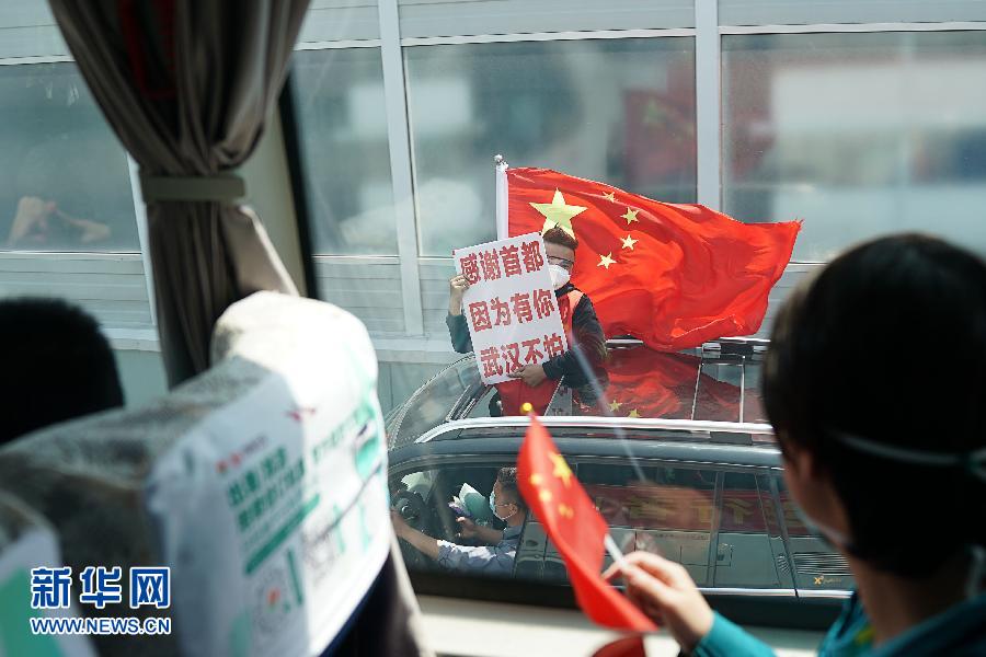 歡送的人群舉著橫幅——“感謝北京,因?yàn)橛心?,武漢不怕”“致敬最美逆行者”等標(biāo)語在陽光下閃動。