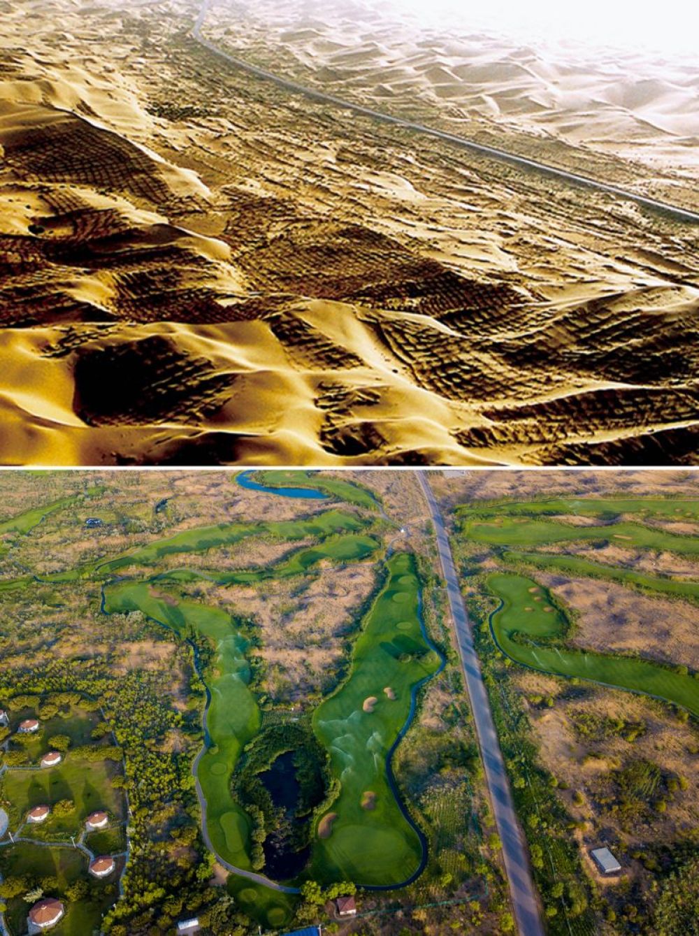 經(jīng)過(guò)30余年的艱苦治理,中國(guó)第七大沙漠——內(nèi)蒙古庫(kù)布其沙漠,從原是飛鳥(niǎo)難越的“死亡之海”,變?yōu)槿缃裆撤寰G谷交相輝映。