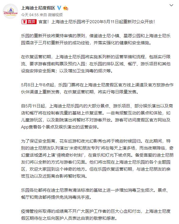 據(jù)上海迪士尼度假區(qū)官方微博消息,上海迪士尼樂園將于2020年5月11日起重新對公眾開放。在恢復(fù)運(yùn)營初期,上海迪士尼樂園將實(shí)施系列新的運(yùn)營舉措和流程,包括實(shí)行限流、要求游客提前購票及預(yù)約入園,在樂園的排隊區(qū)域、餐廳、游樂項(xiàng)目和其他設(shè)施安排安全距離,以及增加衛(wèi)生消毒的頻次等。
