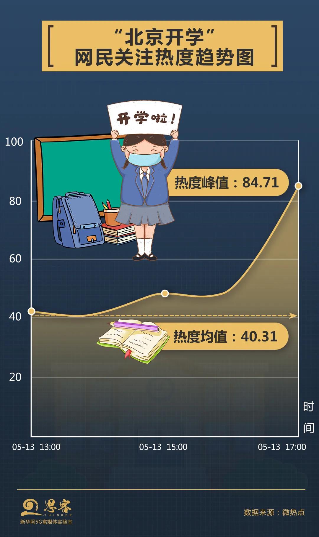 數據顯示,消息公布后,“北京開學”話題的熱度指數迅速飆升,13日17時熱度指數達到84.71,“小學”“復課”“北京”是網民提及最多的詞。在相關討論中,“開學后堅持晨午晚檢制度”“開學后錯峰上學”“中小學暑假不會推遲”等話題關注度較高。