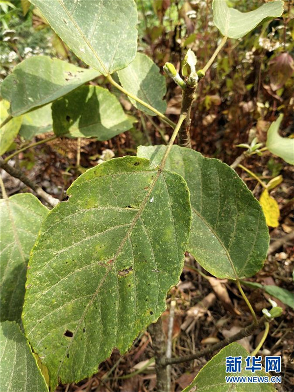 這是4月16日拍攝的在云南高黎貢山國(guó)家級(jí)自然保護(hù)區(qū)保山段發(fā)現(xiàn)的滇桐枝條和葉片。新華社發(fā)(徐聰麗攝)