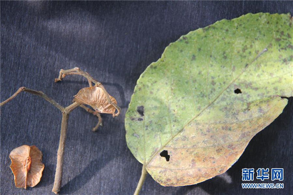 這是4月15日拍攝的在云南高黎貢山發(fā)現(xiàn)的滇桐果實(shí)、果枝和葉片。新華社發(fā)(徐聰麗攝)
