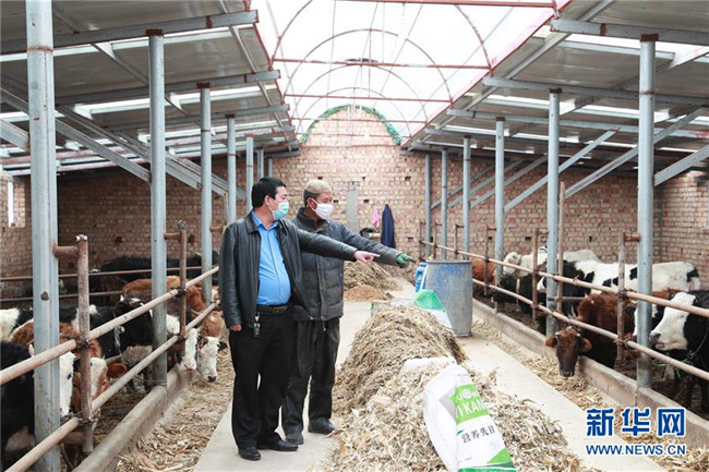 在甘肅省臨夏回族自治州廣河縣莊窠集鎮(zhèn)西坪村,全國(guó)人大代表馬天龍(左)和養(yǎng)牛戶馬志德討論養(yǎng)殖問(wèn)題(3月10日攝)。新華社發(fā)(杜哲宇 攝)