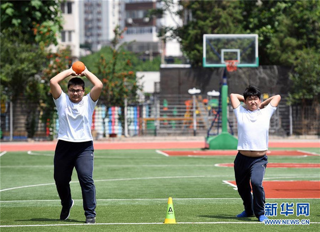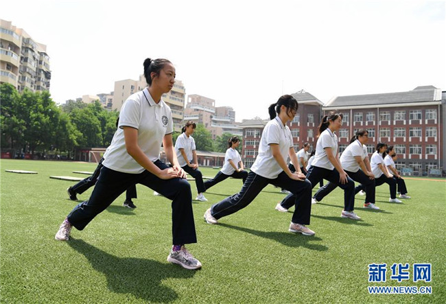 5月28日,北京市第十八中學(xué)初三年級的學(xué)生在體育課上做準(zhǔn)備活動。新華社記者 任超 攝