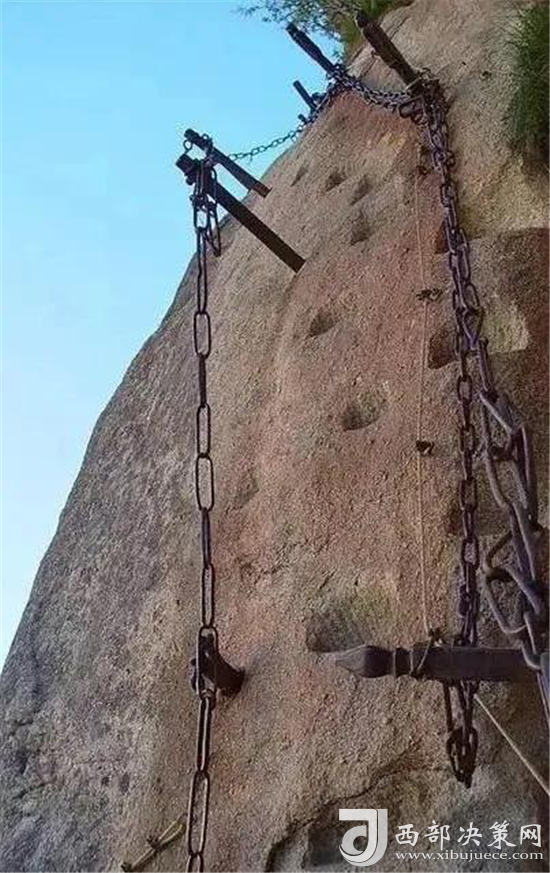 華山還有一處常人不敢涉足的險境--- 鷂子翻身。鷂子翻身在華山東峰是通往下棋亭的必由之路。其路鑿于懸崖上,下視唯見寒索垂于凌空,不見路徑。游人至此,需面壁挽索,以腳尖探尋石窩,交替而下,其中幾步需如鷹鷂一般、左右翻轉身體才可通過。此景只留英雄客,婦孺難聞幾聲咳。這句話現(xiàn)在也未然,巾幗不讓須眉,以后應是往來無懼者,皆是英雄客了。