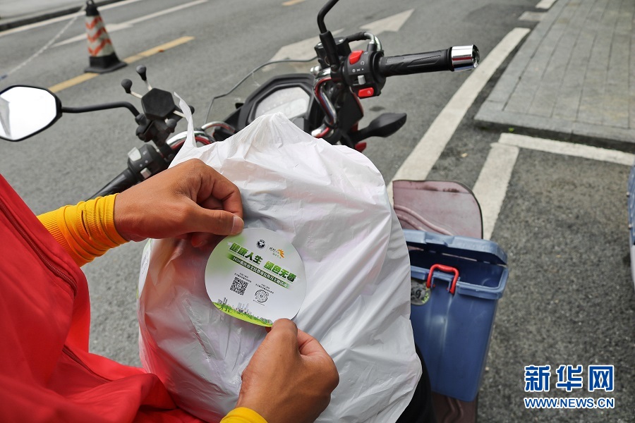 到達(dá)第一單的配送地后,周歡細(xì)心地為外賣貼上禁毒宣傳貼紙并迅速跟顧客取得聯(lián)系。新華網(wǎng)發(fā) (滕華 攝)