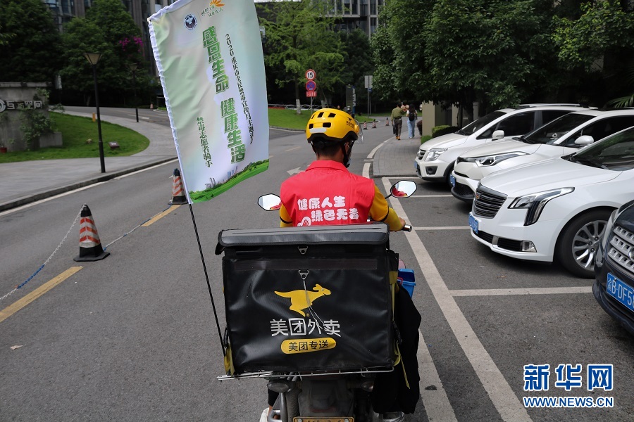 “您好,我是重慶市快遞、外賣騎手禁毒宣傳志愿者,您點(diǎn)的外賣到了。”配送時,周歡把外賣和禁毒宣傳品一同遞交給了顧客,并向她介紹了禁毒知識。新華網(wǎng)發(fā) (滕華 攝)