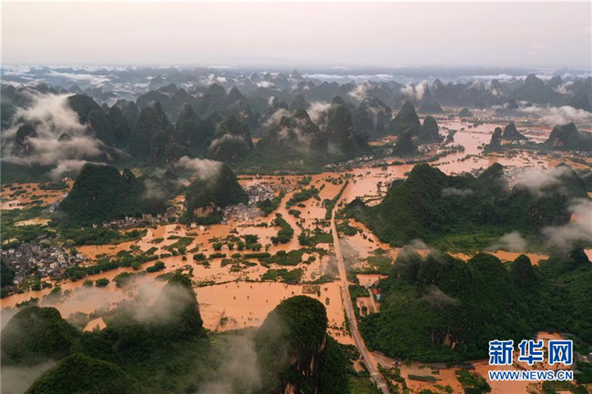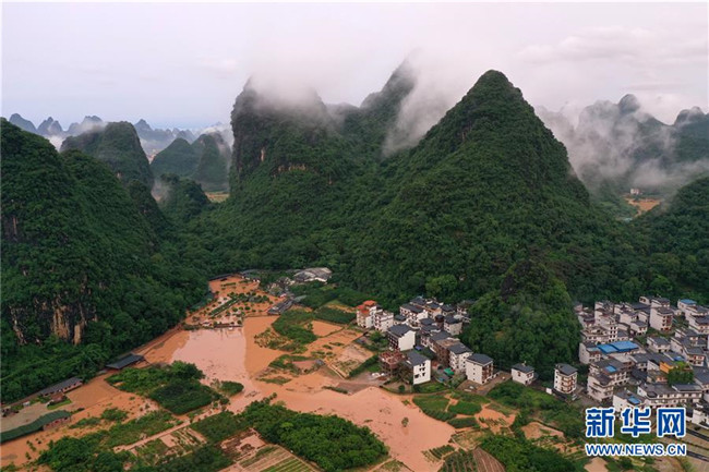 這是廣西陽(yáng)朔縣部分出現(xiàn)嚴(yán)重積水的村莊(6月7日攝,無(wú)人機(jī)照片)。新華社記者 陸波岸 攝