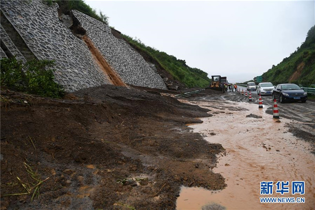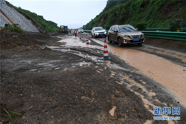 6月7日,在廣西鹿寨至陽(yáng)朔的高速公路上,車(chē)輛從一處發(fā)生滑坡的路段經(jīng)過(guò)。 新華社記者 陸波岸 攝