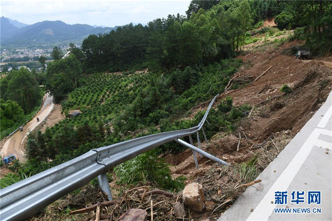 這是廣西陽朔縣普益鄉(xiāng)境內(nèi)的一處滑坡?lián)p毀道路(6月11日攝)。新華社記者 陸波岸 攝