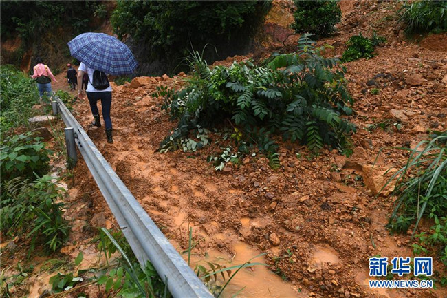 在廣西永??h堡里鎮(zhèn)板峽村,人們經(jīng)過山體滑坡路段(6月9日攝)。新華社記者 陸波岸 攝