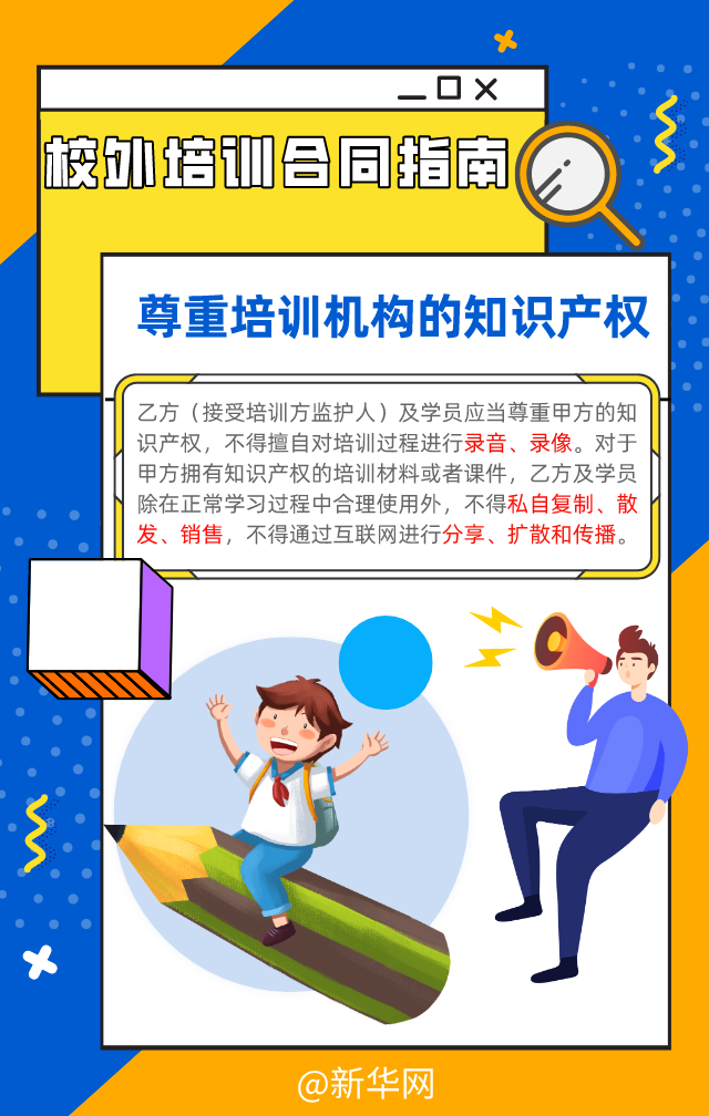 長(zhǎng)期以來(lái),校外培訓(xùn)機(jī)構(gòu)的資質(zhì)問(wèn)題,以及部分培訓(xùn)機(jī)構(gòu)存在違規(guī)收費(fèi)、退費(fèi)難、卷款“跑路”現(xiàn)象,這些令學(xué)生和家長(zhǎng)發(fā)愁。教育部、市場(chǎng)監(jiān)管總局近日發(fā)布《中小學(xué)生校外培訓(xùn)服務(wù)合同(示范文本)》,供培訓(xùn)者(學(xué)員)監(jiān)護(hù)人與開(kāi)展中小學(xué)生校外培訓(xùn)的培訓(xùn)機(jī)構(gòu)簽訂培訓(xùn)合同時(shí)參照使用,為規(guī)范校外培訓(xùn)做出新的探索。一起來(lái)看看,這份“國(guó)家版”標(biāo)準(zhǔn)合同有哪些亮點(diǎn)?