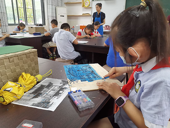 五一小學學生在社團學習版畫。 王磊/攝