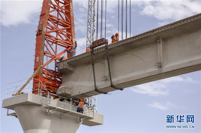 19日上午,位于新疆若羌縣依吞布拉克鎮(zhèn)的G315國道一號大橋上,隨著一根重達16噸的T梁穩(wěn)穩(wěn)落在橋墩上,新疆在建重大工程格(爾木)庫(爾勒)鐵路新疆段最后一座跨315國道的橋梁架設完工。