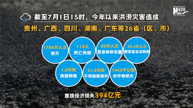 今年汛情帶來的破壞力有多強?張家團告訴記者,截至7月1日15時,今年以來洪澇災害造成貴州、廣西、四川、湖南、廣東等26?。▍^(qū)、市)1786萬人次受災,119人死亡失蹤,85萬人次緊急轉移安置,33.4萬人次需緊急生活救助;1.5萬間房屋倒塌,21.6萬間不同程度損壞;農作物受災面積1465千公頃,其中絕收150千公頃;直接經濟損失394億元。