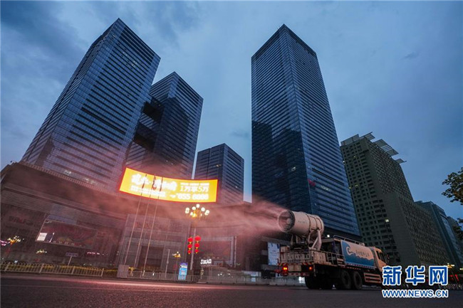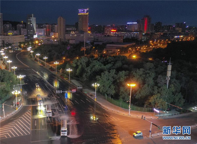 7月20日,烏魯木齊市天山區(qū)城管局清運隊的工作車輛在市區(qū)光明路進(jìn)行消殺作業(yè)。 新華社記者 趙戈 攝