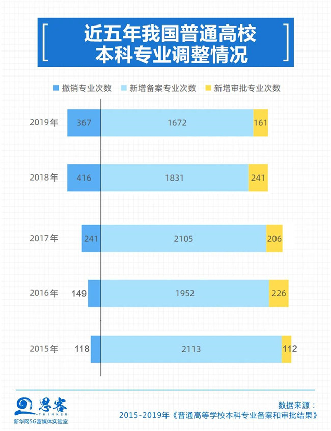 4近五年我國(guó)普通高校本科專業(yè)調(diào)整情況 近年來(lái),隨著經(jīng)濟(jì)社會(huì)的不斷發(fā)展,高校的專業(yè)設(shè)置也在不斷更迭,可供選擇的專業(yè)也越來(lái)越多。2015年開(kāi)始,全國(guó)高校每年增設(shè)專業(yè)數(shù)量在2000個(gè)左右,撤銷專業(yè)的數(shù)量也超過(guò)100個(gè)。
