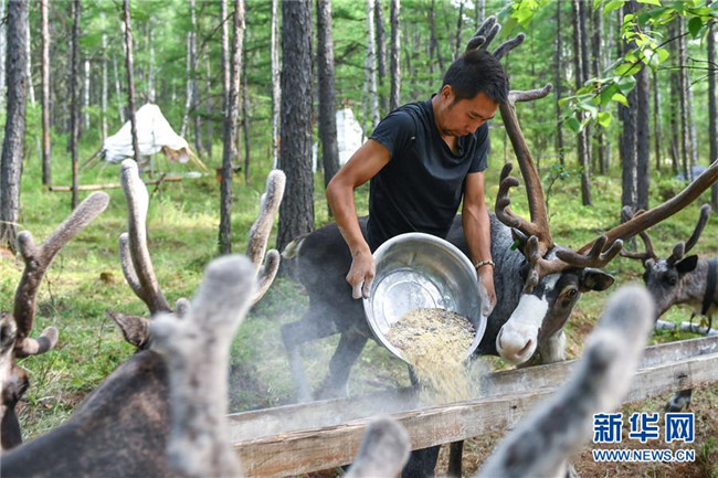 古木森在根河市烏力庫(kù)瑪林場(chǎng)內(nèi)的馴鹿放養(yǎng)點(diǎn)喂馴鹿(7月13日攝)。 新華社記者 貝赫 攝