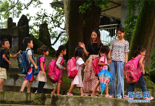 在烏英苗寨教學(xué)點(diǎn),桿洞鄉(xiāng)中心校老師韋春蘭(后排左)和孩子們告別(7月1日攝)。桿洞鄉(xiāng)中心校近期開展送教到烏英活動(dòng),定期到教學(xué)點(diǎn)開展送教工作。 新華社記者 黃孝邦 攝