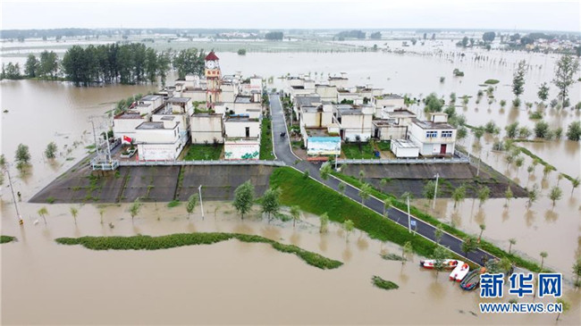 這是被洪水包圍的安徽省阜南縣曹集鎮(zhèn)西田坡莊臺(tái),蓄洪區(qū)內(nèi)的所有莊臺(tái)上都有黨員干部值守(7月24日攝,無(wú)人機(jī)照片)。 新華社記者 張端 攝