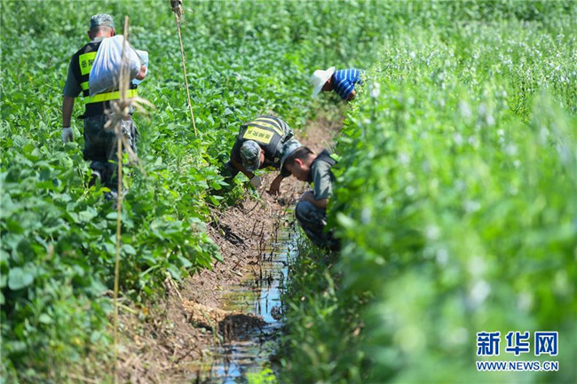 7月15日,安徽省宿松縣洲頭鄉(xiāng)黨委書(shū)記唐志華(左)在查看泗洲村受災(zāi)情況。 新華社發(fā)