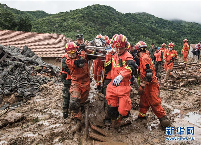 7月8日,在湖北黃岡市黃梅縣袁山村山體滑坡現(xiàn)場(chǎng),救援人員轉(zhuǎn)移救出的年過(guò)八旬的老人。 新華社記者 肖藝九 攝