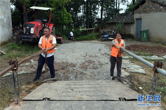 7月20日,在安徽安慶市??阪?zhèn),王啟干的兒子王為民(左)和兒媳王君彥(右)在幫忙啟動(dòng)渡船。 新華社記者 周牧 攝