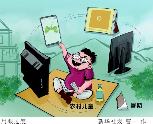 記者走訪發(fā)現(xiàn),暑期用眼過度的現(xiàn)象在不少農(nóng)村兒童中存在。有孩子跟著電視臺(tái)追劇,一看就是一整天;有家長晨起上廁所,竟發(fā)現(xiàn)孩子“刷了一夜手機(jī)”;一位媽媽“吐槽”說,為了讓孩子少看電子產(chǎn)品,每天都要“斗智斗勇”:改密碼、藏充電線、沒收手機(jī)……