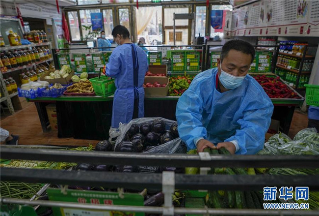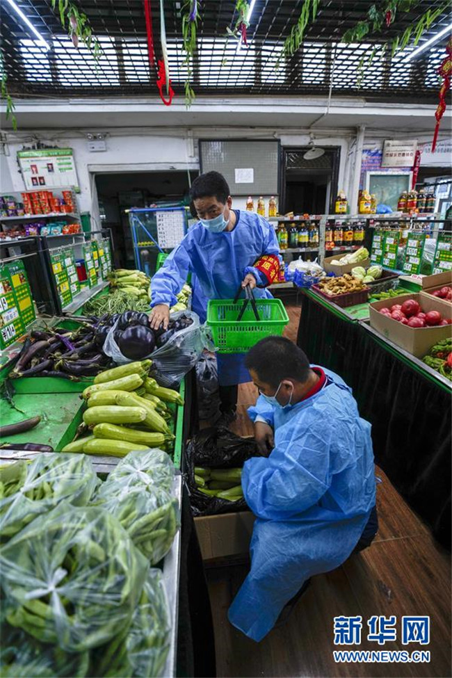 在烏魯木齊市沙依巴克區(qū)揚子江街道青松苑社區(qū)蔬菜直銷點,陳金奇(前)幫助為小區(qū)居民采買的志愿者按照網(wǎng)絡訂單挑選蔬菜(8月8日攝)。新華社記者 趙戈 攝