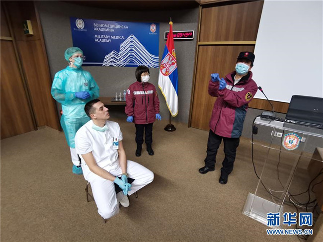 3月28日,中國赴塞爾維亞抗疫醫(yī)療專家組在貝爾格萊德對醫(yī)護人員進行培訓時講解標本采集。 新華社發(fā)(專家組供圖)