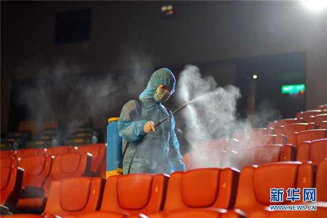 6月26日,馬來西亞吉隆坡一家電影院的工作人員為放映廳消毒。馬來西亞政府允許電影院等場所于7月1日起恢復營業(yè)。新華社發(fā)(張紋綜攝)