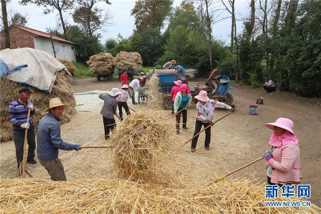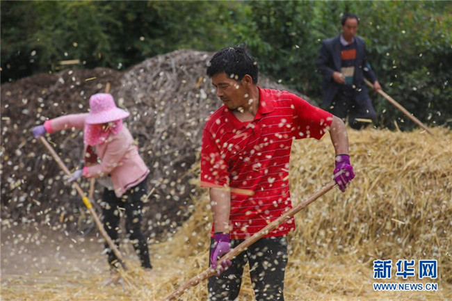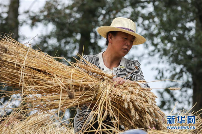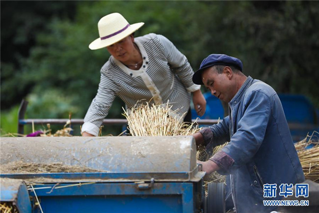 8月22日,元古堆村村民在脫麥子。 目前,在甘肅省定西市渭源縣元古堆村,村民正忙著脫麥子。當?shù)胤N植的590多畝冬小麥近日喜獲豐收。 新華社記者 馬希平 攝
