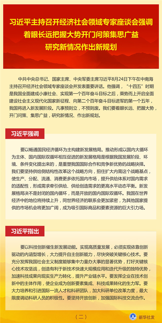 中共中央總書(shū)記、國(guó)家主席、中央軍委主席習(xí)近平8月24日下午在中南海主持召開(kāi)經(jīng)濟(jì)社會(huì)領(lǐng)域?qū)<易剷?huì)并發(fā)表重要講話。他強(qiáng)調(diào),“十四五”時(shí)期是我國(guó)全面建成小康社會(huì)、實(shí)現(xiàn)第一個(gè)百年奮斗目標(biāo)之后,乘勢(shì)而上開(kāi)啟全面建設(shè)社會(huì)主義現(xiàn)代化國(guó)家新征程、向第二個(gè)百年奮斗目標(biāo)進(jìn)軍的第一個(gè)五年,我國(guó)將進(jìn)入新發(fā)展階段。凡事預(yù)則立,不預(yù)則廢。我們要著眼長(zhǎng)遠(yuǎn)、把握大勢(shì),開(kāi)門(mén)問(wèn)策、集思廣益,研究新情況、作出新規(guī)劃。