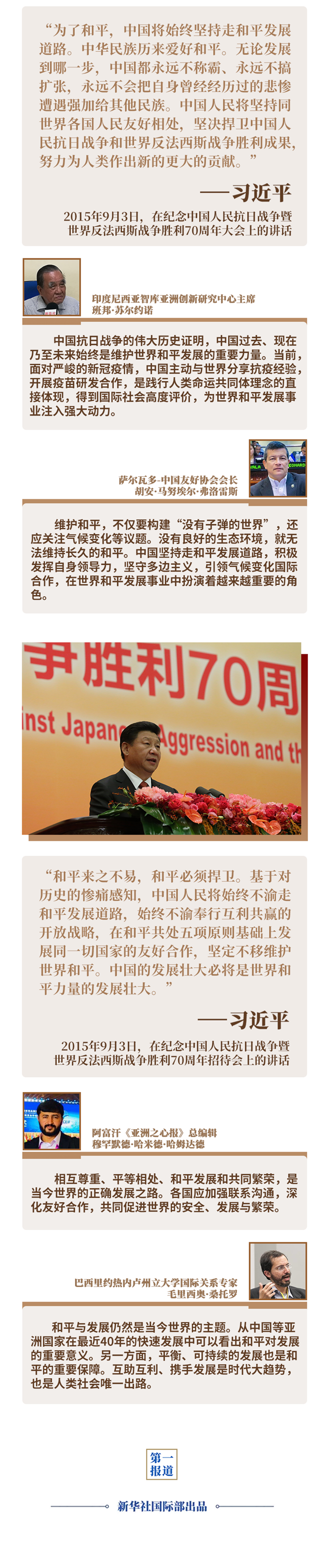 當(dāng)今世界仍不太平,新冠疫情推動(dòng)百年變局加速變化,進(jìn)入動(dòng)蕩變革期的世界亟需明確前行方向。此時(shí),重溫5年前習(xí)近平主席紀(jì)念中國(guó)人民抗日戰(zhàn)爭(zhēng)暨世界反法西斯戰(zhàn)爭(zhēng)勝利70周年重要講話中關(guān)于和平發(fā)展的重要論述,尤其具有現(xiàn)實(shí)意義——