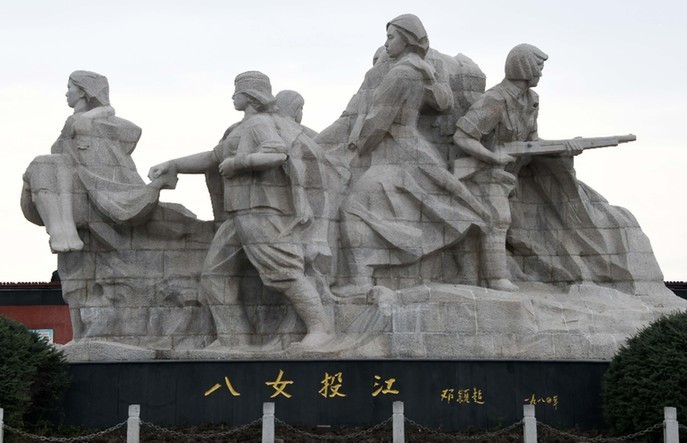 她們是東北抗日聯(lián)軍第5軍婦女團(tuán)的政治指導(dǎo)員冷云,班長胡秀芝、楊貴珍,戰(zhàn)士郭桂琴、黃桂清、王惠民、李鳳善和被服廠廠長安順福。1938年10月,該部在牡丹江地區(qū)烏斯渾河渡口與日偽軍千余人遭遇。已行至河邊準(zhǔn)備渡河的婦女團(tuán)8名成員,為掩護(hù)大部隊突圍,毅然放棄渡河,在冷云率領(lǐng)下,分成3個戰(zhàn)斗小組,與日偽軍展開激戰(zhàn)。她們主動吸引日偽軍火力,使部隊主力得以迅速擺脫敵人的攻擊,但她們卻被敵人圍困于河邊。在背水作戰(zhàn)至彈盡的情況下,面對日偽軍逼降,女戰(zhàn)士們誓死不屈。她們毀掉槍支,挽臂涉入烏斯渾河,高唱著《國際歌》,集體沉江,壯烈殉國。犧牲時,她們年齡最大的冷云23歲,最小的王惠民才13歲。