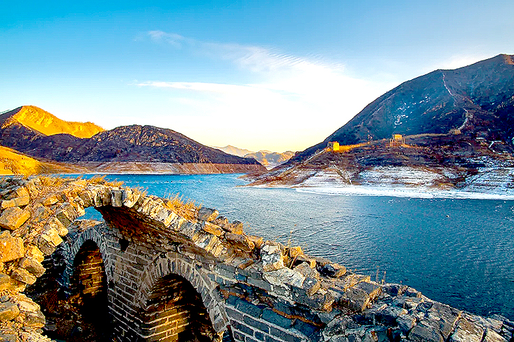 1975年至1981年,為了給天津供水,利用這里的山形地勢,在灤河上游寬城、遷西、興隆三縣交界處,修建了潘家口水庫。引灤入津工程橫切長城,喜峰口、潘家口兩座雄關(guān)鑲?cè)胍惶侗滩?,從而形成萬里長城一處絕景——“水下長城”。