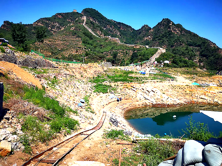 現(xiàn)場施工負(fù)責(zé)人杜勝軍說:“這段長城維修難點是運輸,今年水位下降比較厲害,增加了運輸難度。”