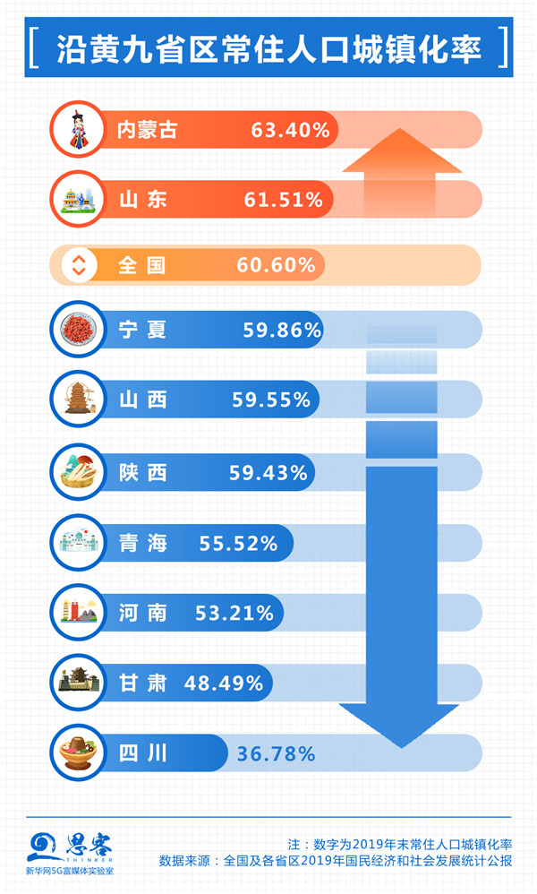 鄭州、西安、濟(jì)南等中心城市和中原等城市群帶動(dòng)區(qū)域內(nèi)城市及城市群加快建設(shè),但目前九省區(qū)城鎮(zhèn)化水平及中心城市輻射帶動(dòng)能力仍有待提升。沿黃九省區(qū)僅有內(nèi)蒙古和山東的常住人口城鎮(zhèn)化率高于全國平均水平。從中心城市看,流域內(nèi)鄭州和西安的地區(qū)生產(chǎn)總值在九大國家中心城市中處在相對(duì)較后的位置。西寧、蘭州、銀川等首位度相對(duì)較高的省會(huì)城市輻射帶動(dòng)能力也有限。