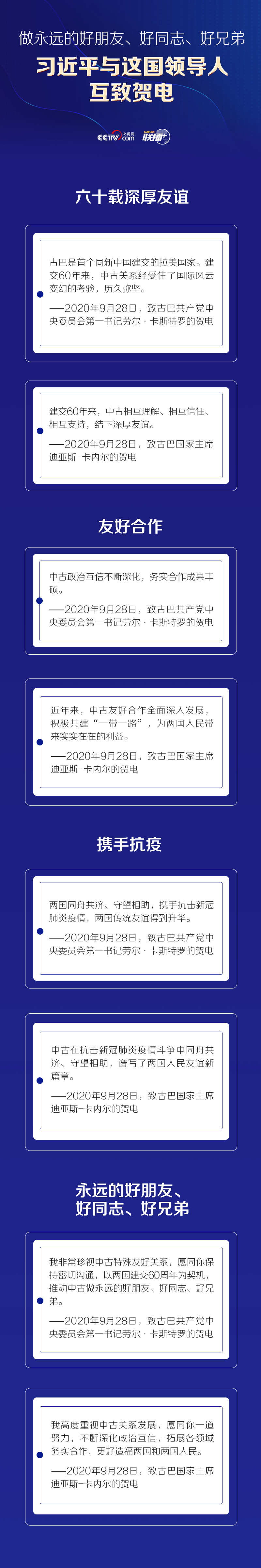 9月28日,中共中央總書記、國家主席習近平分別同古巴共產(chǎn)黨中央委員會第一書記勞爾·卡斯特羅、古巴國家主席迪亞斯-卡內爾互致賀電,熱烈慶祝兩國建交60周年。