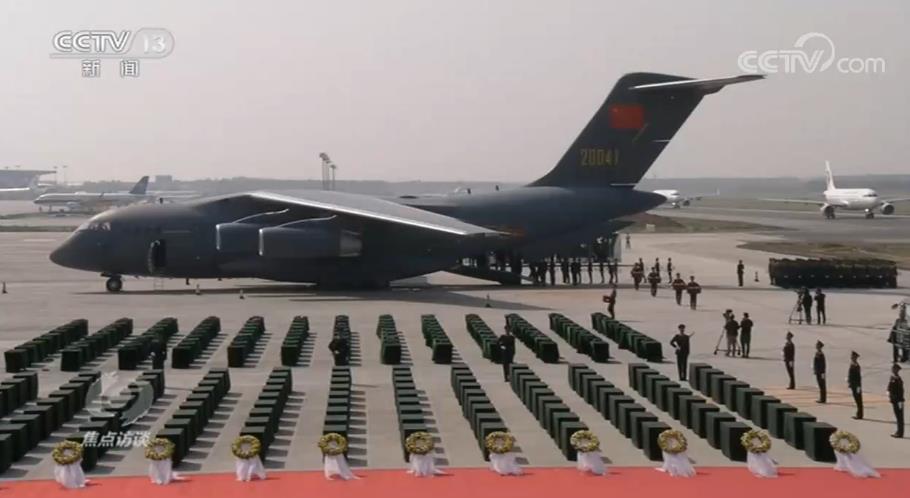 27日11點18分, 載有117位在韓志愿軍烈士遺骸的中國空軍運-20專機降落在沈陽桃仙國際機場。機場用 “過水門”迎接祖國的英雄兒女回家,這是航空界最高級別禮儀。兩架中國空軍殲11—B戰(zhàn)機低空拉煙通場,向英雄致敬。
