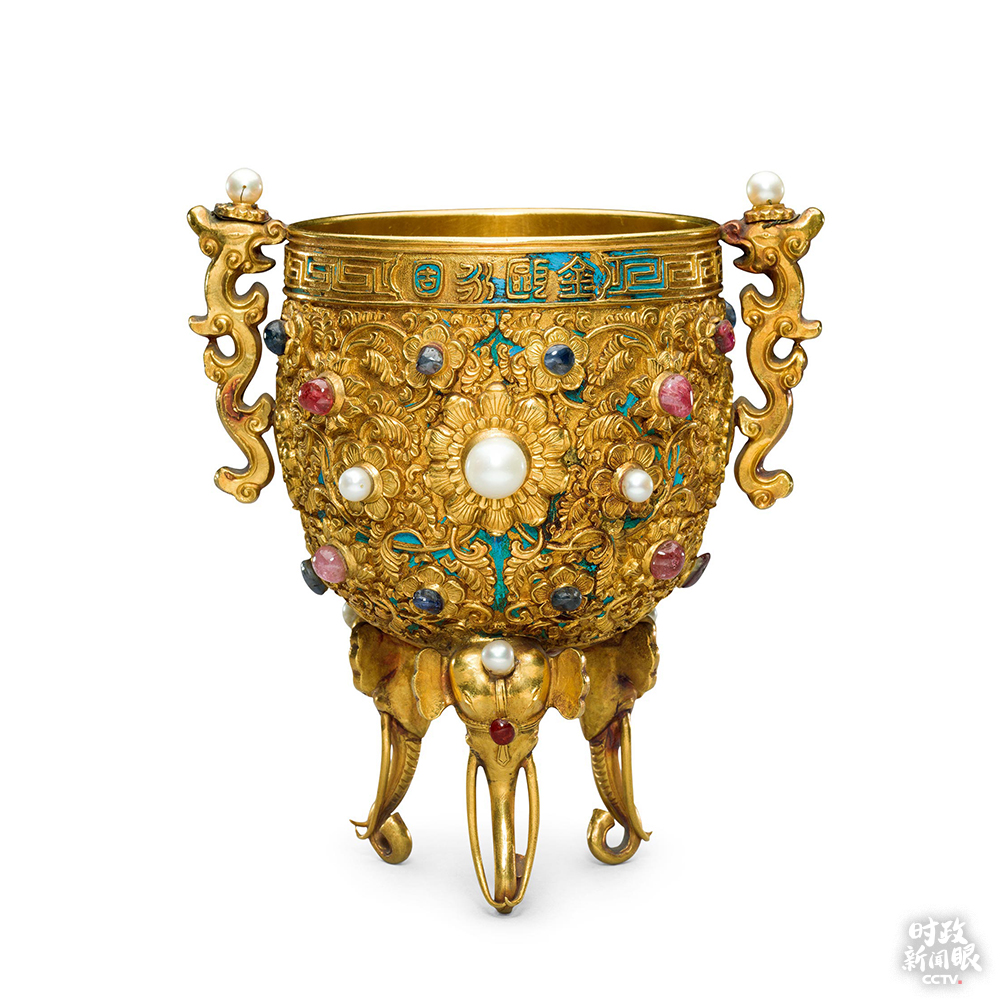 △正在故宮博物館展出的金嵌珠寶金甌永固杯,通體以點翠為地,造型優(yōu)美。(來源于故宮博物院官網(wǎng))