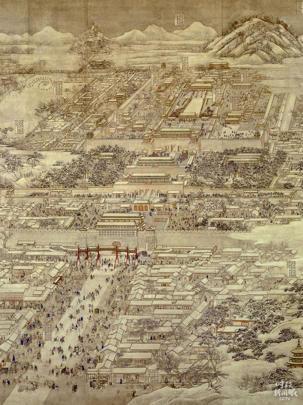 △這是《京師生春詩意圖》軸,由清代宮廷畫家徐揚繪制。從上至下的鳥瞰式構(gòu)圖,為后人研究北京城城建布局提供了寶貴參考。(來源于故宮博物院官網(wǎng))