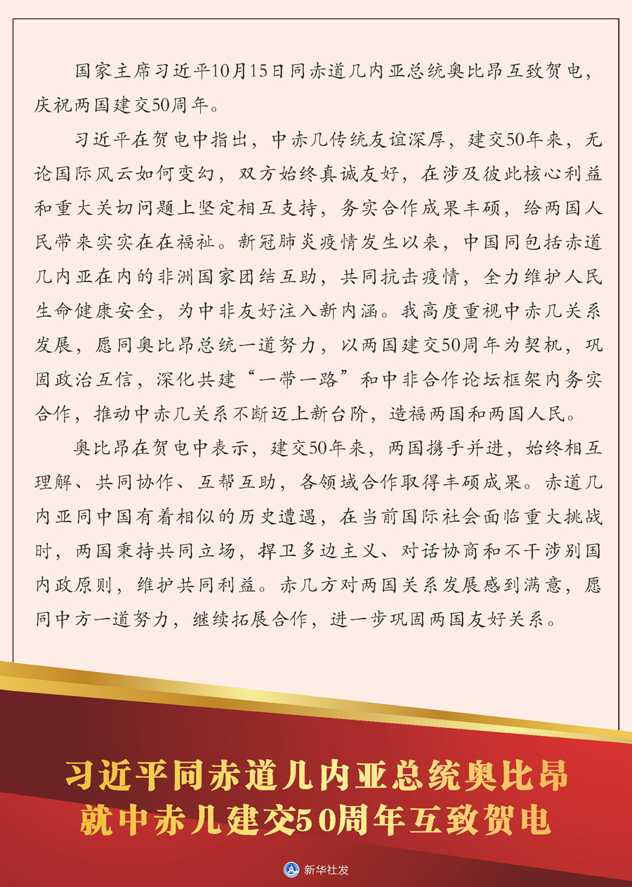習(xí)近平在賀電中指出,中赤幾傳統(tǒng)友誼深厚,建交50年來,無論國際風(fēng)云如何變幻,雙方始終真誠友好,在涉及彼此核心利益和重大關(guān)切問題上堅(jiān)定相互支持,務(wù)實(shí)合作成果豐碩,給兩國人民帶來實(shí)實(shí)在在福祉。新冠肺炎疫情發(fā)生以來,中國同包括赤道幾內(nèi)亞在內(nèi)的非洲國家團(tuán)結(jié)互助,共同抗擊疫情,全力維護(hù)人民生命健康安全,為中非友好注入新內(nèi)涵。我高度重視中赤幾關(guān)系發(fā)展,愿同奧比昂總統(tǒng)一道努力,以兩國建交50周年為契機(jī),鞏固政治互信,深化共建“一帶一路”和中非合作論壇框架內(nèi)務(wù)實(shí)合作,推動(dòng)中赤幾關(guān)系不斷邁上新臺(tái)階,造福兩國和兩國人民。