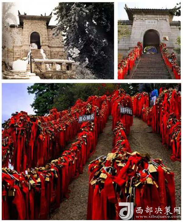 到達(dá)金鎖關(guān)時(shí),眼前大片大片的紅色,游人的視覺(jué)和心靈受到強(qiáng)烈的沖擊。這是沿路兩邊鐵鏈上綁滿的密密麻麻的紅色絲繩,不留一絲空隙,風(fēng)吹來(lái),長(zhǎng)長(zhǎng)的紅色絲繩就輕盈的舞起來(lái),如愛(ài)情牢固的臂膀,甜蜜的飛翔在華山之上。讓一把感情鎖和華山一同到地老天荒,成為一個(gè)“山無(wú)陵,天地絕,乃敢與君絕”的千古情愛(ài)神話。