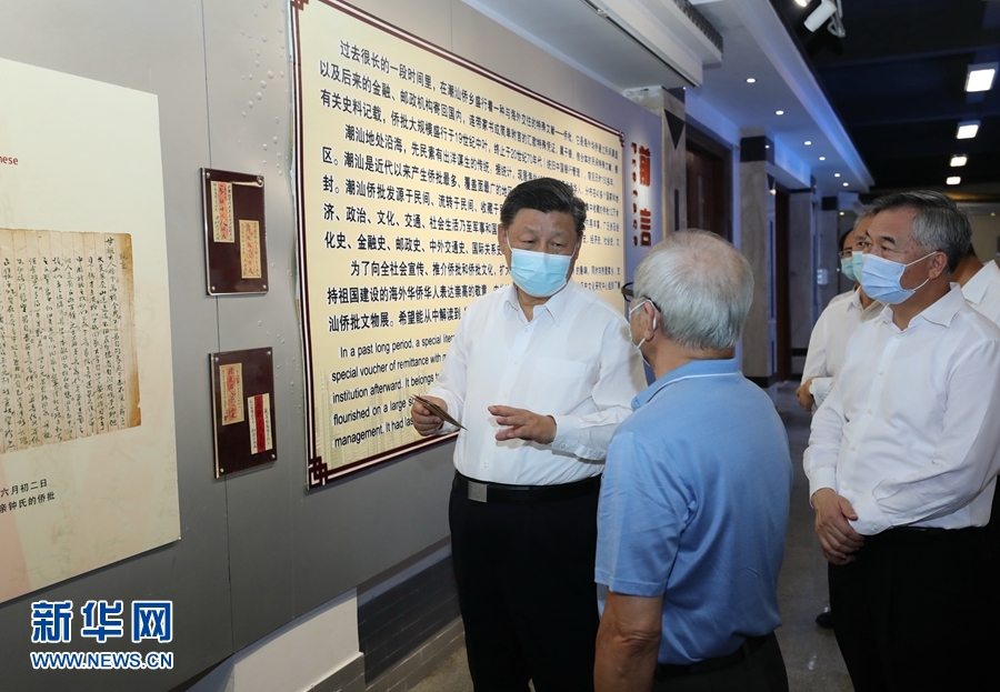 隨后,習(xí)近平參觀了具有潮汕僑鄉(xiāng)特色的僑批文物館。過去很長一段時間,海外華僑通過民間渠道將連帶家書或簡單附言的匯款憑證寄回國內(nèi),這些“僑批”成為研究近代華僑史的珍貴檔案。習(xí)近平聽取僑批歷史和潮汕華僑文化介紹。他強調(diào),“僑批”記載了老一輩海外僑胞艱難的創(chuàng)業(yè)史和濃厚的家國情懷,也是中華民族講信譽、守承諾的重要體現(xiàn)。要保護(hù)好這些“僑批”文物,加強研究,教育引導(dǎo)人們不忘近代我國經(jīng)歷的屈辱史和老一輩僑胞艱難的創(chuàng)業(yè)史,并推動全社會加強誠信建設(shè)。潮汕地區(qū)是我國著名僑鄉(xiāng)。汕頭經(jīng)濟特區(qū)要根據(jù)新的實際做好“僑”的文章,加強海外華僑工作,引導(dǎo)和激勵他們在支持和參與祖國現(xiàn)代化建設(shè)、弘揚中華文化、促進(jìn)祖國和平統(tǒng)一、密切中外交流合作等方面發(fā)揮更大作用。